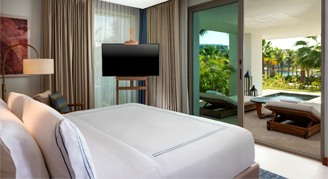 Suites feature a resort or partial-ocean view. Additional amenities include a separate living and dining area and a private plunge pool on the outdoor terrace.