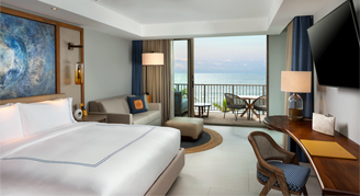 Suites feature a resort or partial-ocean view and a separate living and dining area.