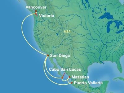 Explore Mexico's sun-washed jewels: Cabo San Lucas, Ensenada, and Puerto Vallarta. Then unwind on days at sea as you trace the coast to San Diego.