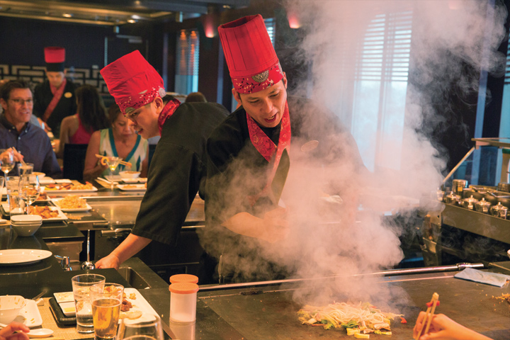 Teppanyaki: Flying shrimp. Onion volcanoes. Twirling knives. The sizzles and surprises never cease at Teppanyaki, Norwegian's authentic Japanese hibachi restaurant. Sit around a lively shared table as a skillful chef slices, chops and grills steak, seafood and chicken on a large steel grill right before your eyes. Norwegian's chilled, sake-infused wasabi cocktail will have you flipping, too. This restaurant is available for an additional cost.