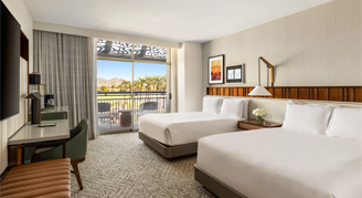 Unwind in this expansive room, featuring two plush queen beds, a soothing bathtub and a sleeper sofa. Embrace the tranquil atmosphere of the desert with picturesque views from your private patio.