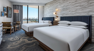 These deluxe rooms are perfect for families visiting San Diego, proving a cozy oasis to unwind. Get ready for your day in the cheerful guest bathroom which offers oversize mirrors and bright lighting. Relax on your private balcony with views of the city skyline or marina sunset.