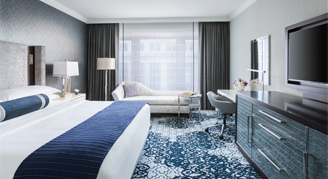 Rooms feature one king bed, a writing desk and chair, a marble bathroom with double vanities and a shower/tub combination, and access to the Club Lounge.
