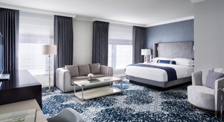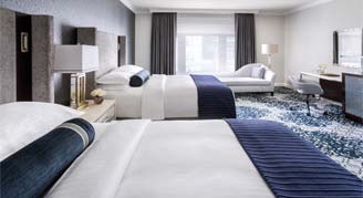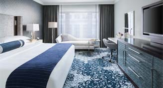 With a blend of modern technology and couture design, hotel rooms provide a welcome retreat. Featuring crisp whites, deep blues and rich grays to inspire tranquility.
