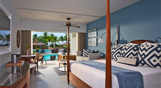 Suites feature a king sized bed, a spacious living room and dining room, a full bathroom with hydro tub, and a private, furnished terrace with hot tub and direct swim out access to pool. Suite features oceanfront views.