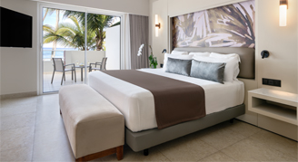 Suites feature an oceanfront view. Additional amenities include a large living area with sofa, separate bedroom, a separate guest bathroom, and sun lounger as well as an oversize bathroom featuring two wardrobes, double sinks, rain shower and bathtub with Jacuzzi.