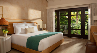 This suite offers a large terrace on the first floor or large balcony on the second floor overlooking the lush tropical flora of the resort. Includes a king-size bed with a living room area, including a large sofa and tasteful furniture. The bathroom has two beautiful vanities with a large mirror, walk-in shower, and separate toilet and closets.