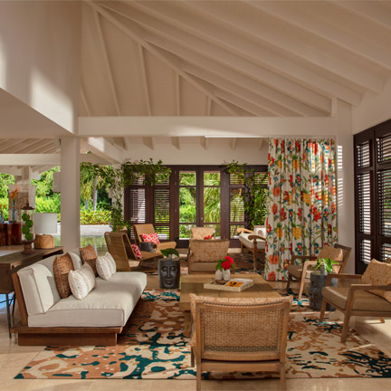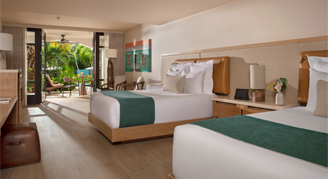 This suite offers a large terrace on the first floor or large balcony on the second floor overlooking the lush tropical flora of the resort. Includes two queen-size beds with a living room area, including a large sofa and tasteful furniture. The bathroom has two beautiful vanities with a large mirror, walk-in shower, and separate toilet and closets.