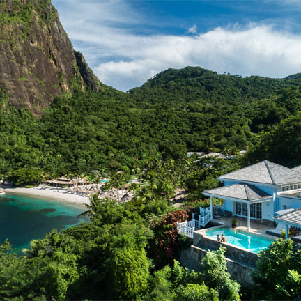 Jade Mountain is an architectural marvel with its open-walled infinity pool sanctuaries, celebrating stunning views of Saint Lucia's Pitons and the Caribbean Sea. While Sky Sanctuaries do not have an infinity pool, they offer a Jacuzzi with a view of the Pitons and the Caribbean Sea. Amenities include a spa and fitness, yoga, an organic farm and chocolate laboratory. Guests can enjoy privileges at the adjoining 600-acre sister resort – Anse Chastanet – which features two beaches, additional restaurants, mountain bikes, hiking and jogging trails, tennis, bird watching and watersports. The exceptional location allows for scuba diving with a PADI Certified Dive Operation on-site.