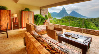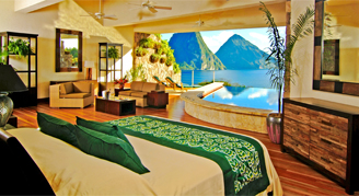 Rooms offer a view of the Pitons and the Caribbean Sea. Additional amenities include an open fourth wall and a private infinity pool.