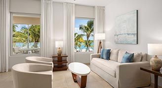 Suites feature direct views of the ocean and beach area, spacious balconies with views of the surrounding tropical landscape. All Two-Bedroom Suites include one king bed in each of the two bedrooms and a sofa bed (or up to two rollaway beds) in the living room, two marble bathrooms, three flat-screen HDTVs, fully equipped kitchen, dining table, air conditioning, ceiling fans, laptop-size safe, washer/dryer and an iron/ironing board.