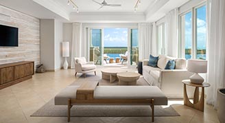 Suites feature direct views of the ocean and beach area from a spacious balcony. It includes one king bed in each of the three bedrooms and a sofa bed (or up to two rollaway beds) in the living room, three marble bathrooms each with a shower/tub combination and a half-bathroom in the foyer, four flat screen HDTVs, fully equipped kitchen, dining table, air condition, ceiling fans, laptop-size safe, washer/dryer and an iron/ironing. Maximum occupancy: 8.