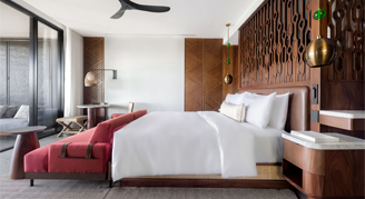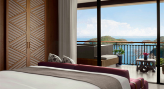 This expansive suite features a private balcony with breathtaking ocean views and a separate living area, providing a peaceful and refreshing retreat.