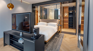 Designed with creativity and uniqueness in mind, this spacious suite beautifully blends style and texture within an open floor plan for guests to get lost in. Enjoy this loft-style suite with a king bed, lounge area with a sofa, comfortable in-room work space and creativity area, and a modern bathroom with a bathtub and rain shower.
