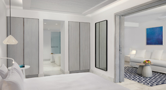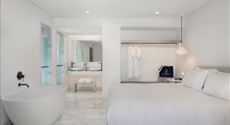 These rooms include private infinity pools and terraces with a pergola, outdoor dining, and daybeds. Rooms offer a serene ambiance with a free-standing bathtub.