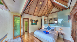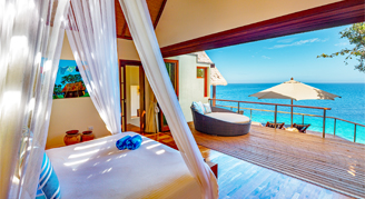 Villas are located at irregular angles on the southern and eastern sides of the island and feature an ultimate ocean view. Additional amenities include lush tropical gardens and ancient trees providing absolute privacy, a split-level, open-plan design, tropical décor, high ceilings, a separate living room and bedroom, an awning over the bed, two private decks and a plunge pool. These villas are the most spacious and private, and offer the most amount of sun on the deck.