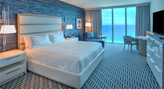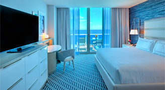 Enjoy breathtaking panoramic views of the Atlantic Ocean through floor-to-ceiling windows. This room offers a king bed outfitted in high-quality linens with plush pillows, bath amenities, a lavish bathrobe, slippers, 55-inch flat-screen HDTV, mini-fridge, spacious work desk with ergonomic chair, Keurig coffee maker and an in-room safe.