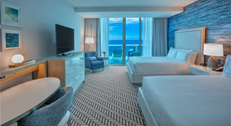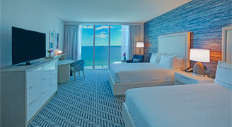 Enjoy breathtaking panoramic views of the Atlantic Ocean through floor-to-ceiling windows. This room offers two queen beds outfitted in high-quality linens with plush pillows, bath amenities, a lavish bathrobe, slippers, 55-inch flat-screen HDTV, mini-fridge, spacious work desk with ergonomic chair, a Keurig coffee maker and an in-room safe.