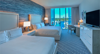 Watch the boats go by on the Intracoastal Waterway directly across the street through floor-to-ceiling windows. This room offers two queen beds outfitted in high-quality linens with plush pillows, bath amenities, a lavish bathrobe, slippers, 55-inch flat-screen HDTV, mini-fridge, spacious work desk with ergonomic chair, Keurig coffee maker and an in-room safe.