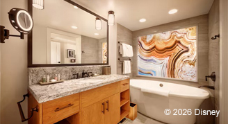 Rooms feature views of pool, Bay Lake, Woodlands, Courtyard, Disney’s Wilderness Lodge or Boulder Ridge Villas at Disney’s Wilderness Lodge. Accommodations include one king bed and two queen beds and one queen-size sleeper sofa. Includes two full bathrooms (each with two sink areas), full kitchen, living and dining areas, washer and dryer, and a porch or balcony.