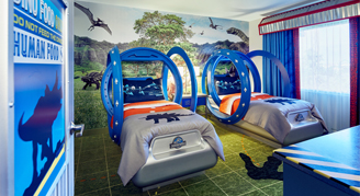 This 670-square-foot suite features one bedroom with a king bed and a sofa bed, separate bath and vanity areas, and a second kids' room. The children's room opens only into the adult's room, and not into the hallway, and is themed in Jurassic World décor with two twin beds, a desk and chair, separate closet and a flat-screen television. Maximum occupancy of five guests (3 adults maximum).