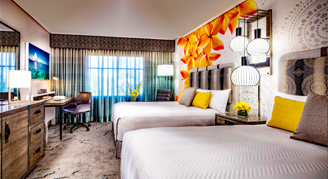 Get swept away to a place filled with tropical wonders. This 335-square-foot room features two queen beds, and separate bath and vanity areas. Maximum occupancy of five guests.
