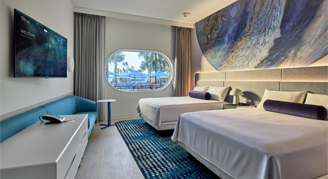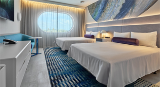 These rooms feature sweeping curves, terrestrial tones and spaceship-styled windows, inspiring thoughts of exploring new worlds on an uncharted course. This 315-square-foot room features two queen beds, and a separate bath and vanity areas. Maximum occupancy of four guests.