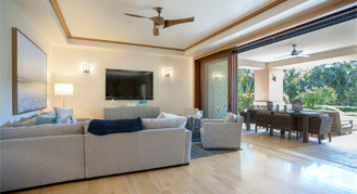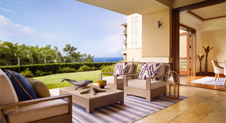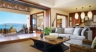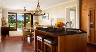 Residences feature views of the resort gardens from the lanai. Additional amenities include a separate living and dining room, full kitchen, three and a half baths, and a sleeper sofa in the living room.