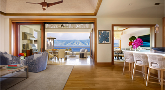 Residences feature views of Molokai and the ocean from the lanai. Additional amenities include a separate living and dining room, full kitchen, three and a half baths, and a sleeper sofa in the living room.