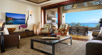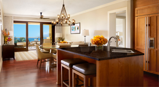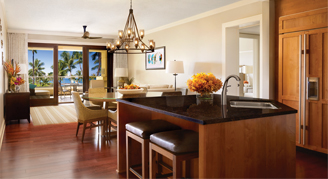 Residences feature views of the resort gardens from the lanai. Additional amenities include a separate living and dining room, full kitchen, a sleeper sofa in the living room and accessible accommodations.