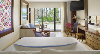 Additional amenities include direct access to a pool and an in-room Jacuzzi.