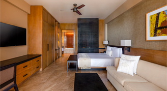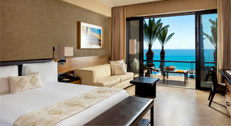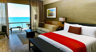Suites feature an ocean view with a large corner terrace. Additional amenities include a separate living area and two bathrooms.