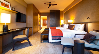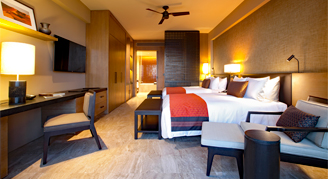 Sophisticated rooms feature a modern design, a neutral color palette, marble and wood accents, and a soaking tub.