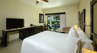 Contemporary Caribbean décor enhances these elegant suites. Select suites feature an open-air shower, an infinity plunge pool or direct access to a lazy river that connects to the main pool.