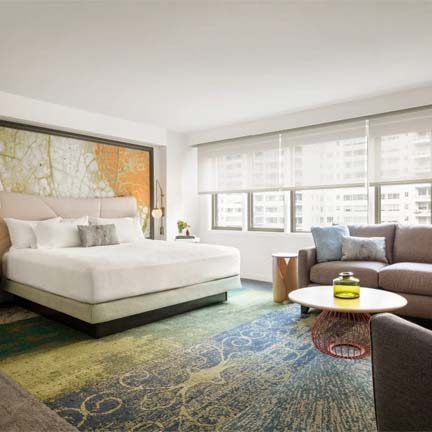 The Fifty Sonesta Hotel New York is a boutique hotel in Midtown Manhattan, steps from Rockefeller Center, Times Square, the Theater District and premier shopping on Fifth and Madison Avenues. Accommodations include eclectic guest rooms, studios and suites, with select options offering kitchens and private terraces.