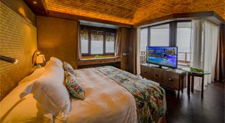 Bungalows are built near the secluded end of the resort, and are situated over deeper water and feature a ocean view. Additional amenities include a large bathroom with a Jacuzzi tub, a separate shower, and a sundeck and platform for swimming or snorkeling.
