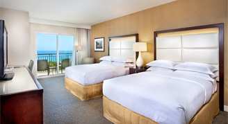 Rooms feature two queen beds, an armchair, a work desk, and balcony with views of the Pacific Ocean. Additional amenities include a 50-inch HDTV and bathrobes.