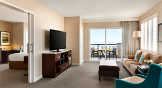 Suites feature a room with one king bed and a desk; a separate living room with a queen-sized pull-out sofa, dining area and wet bar; bathroom with a soaking tub and separate shower; and furnished balcony with views of the Pacific Ocean. Additional amenities include a 55-inch HDTV and bathrobes.