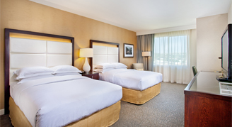 Rooms feature two queen beds, an armchair, and a work desk. Additional amenities include a 50-inch HDTV and bathrobes.