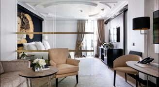 Room décor is inspired by Las Meninas, the Velazquez masterpiece. Sharp, clean lines and fine textiles have been used to recreate classical elegance with a modern flair.