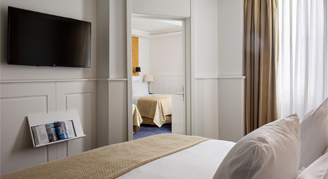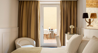 Rooms designed specifically for families of two adults and two small children. They face an inner courtyard and are elegantly decorated. Equipped with two 135cms beds and glass paneled bath integrated into the bedroom.