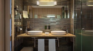All rooms are outward facing, comfortable and bright, and offer a flat-screen television, reading lights built into the bed's headboard, and a pillow menu on request. Air conditioning is available with individual climate control and an automation system to regulate the climate selected when away from the room. Modern bathrooms are finished in bronze-colored ceramics with granite countertops and double sinks, and feature audio equipment to hear the television. Bathrooms have a separate shower and bathtub, and all rooms feature complimentary Wi-Fi.