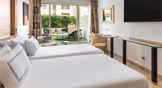 Bright and spacious room with a separate lounge with a sofa-bed, dining table and a terrace with magnificent views of Plaza de España and the hotel pool. Rooms feature a separate hall-dressing room with two large closets, a soundbar with Bluetooth connection and two 43-inch plasma TVs. Bathrooms have a larger shower with an upgraded shower head.