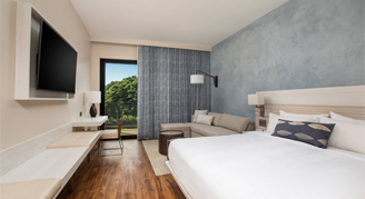 Relax in elegantly designed, modern hotel suites featuring mini-fridges, plush pillows, and upscale amenities.