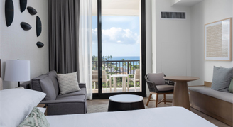 Suite features views of the ocean from the lanai. Additional amenities include a separate living area, a walk-in closet, dual vanities, soaker tub, two flat screen TVs and two lanais.