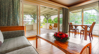 Room features lush garden views, a dining table, and sliding glass doors that open onto a lanai with outdoor seating.