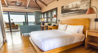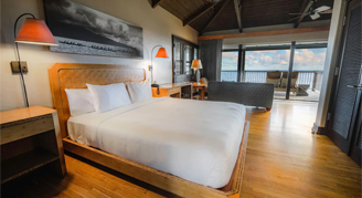 Suite features sweeping, uninterrupted ocean views, vaulted ceilings, a separate living area, a dining table and wet bar.
