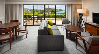 Suites feature optimal views of the Pacific and neighboring islands from within the room. Additional amenities include a wet bar, two-flat screen TVs with cable, microwave, and a stylish bathroom with full amenities.