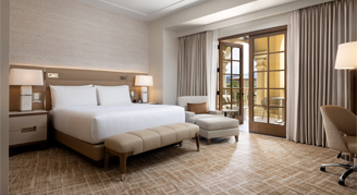 This room includes one king bed and views of the surrounding urban area and landscaping, plus an oversized marble bathroom with step-in shower. Amenities include LED vanity mirrors for spa-like illumination, a fully stocked minibar, 65″ smart TV, Nespresso machine, Conair garment steamer, automated lighting control system, plush robes and a vintage inspired analog alarm clock with Bluetooth audio and integrated wireless charging.