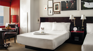 Overlooking The Strip, this room offers 406 square feet of space ideal for gathering. Original artwork along with comfortable window seating and custom-designed furnishings create a residential feel. Fresh bathrooms offer a spacious walk-in shower.